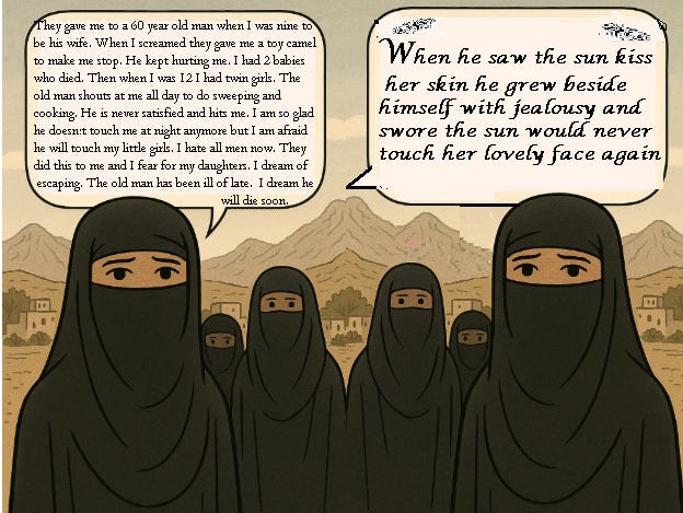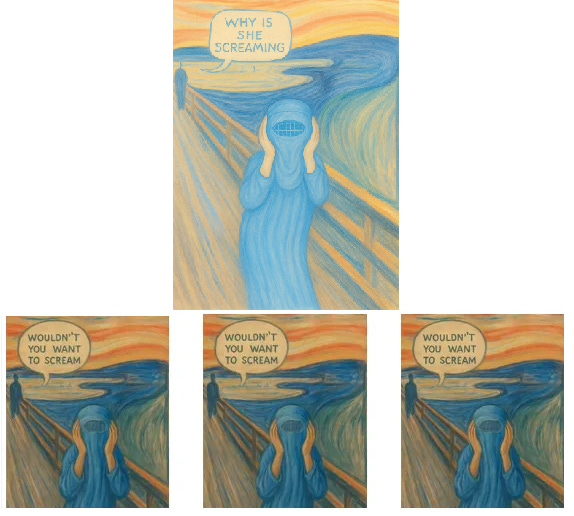 This time, Ai came up with the exact image that I’d requested. I’m getting better at giving precise instructions and also finding ways around the built-in censorship and biases on AI platforms.