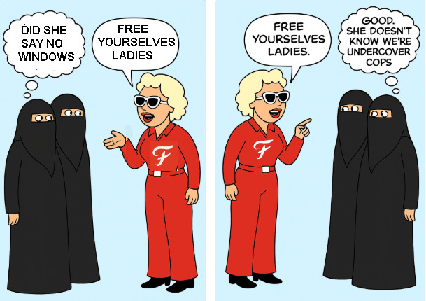 After the clip of KJK saying free your faces was posted online it recieved a lot of notice from women in countries where women are compelled to wear the burqa. She received a lot of letters addressed to her personally from Saudi women who asked her to post their messages on their behalf so that they could speak out but remain anonymous for their own safety. She did, and I’ve used some clips from the messages posted in a couple of the speech bubbles. KJK has also devoted a section of her Standing For Women/LWS page to the letters she is receiving.